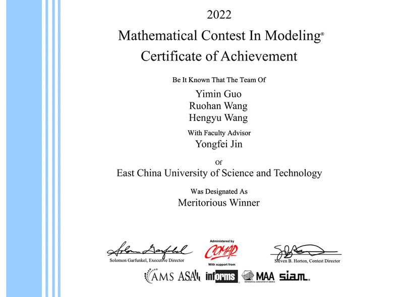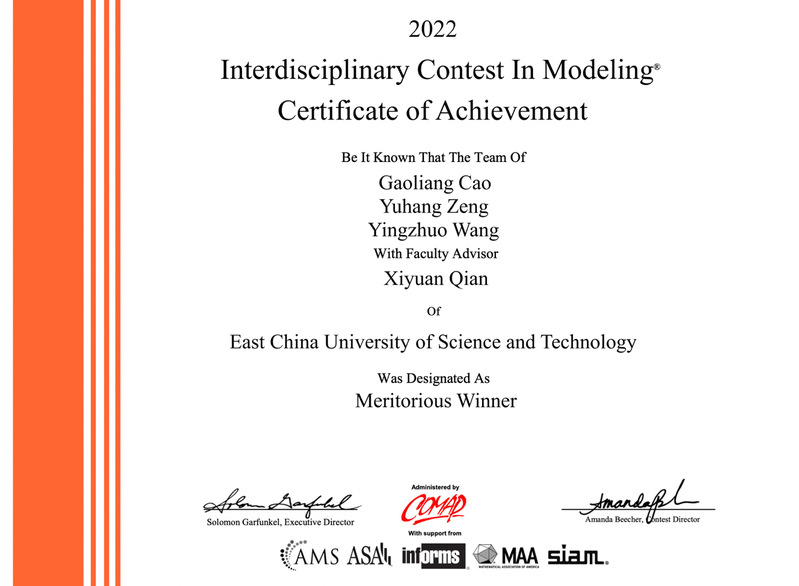 近日,2022年美国大学生数学建模竞赛结果公布,我校学子喜获佳绩。其中,由beat365体育官网钱夕元老师指导的信息学院2020级本科生曹高梁、曾宇航、王颖卓团队,以及beat365体育官网靳勇飞老师指导的信息学院2019级本科生郭懿敏、王若菡、中德工学院王恒煜团队获得一等奖(Meritorious Winner)。此外,我校还有6支参赛团队获得二等奖(Honorable Mention)。