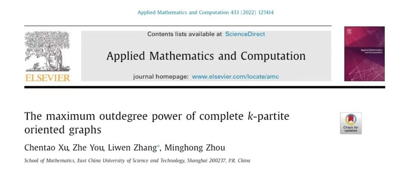 近日,beat365体育官网2019级本科生许晨涛、游哲、周明弘和2019级研究生张力文在国际知名期刊APPLIED MATHEMATICS AND COMPUTATION(该期刊连续四年在JCR SCI分区中位列MATHEMATICS, APPLIED - SCIE(Q1),影响因子为4.397)发表了题为The maximum outdegree power of complete k-partite oriented graphs的研究成果。指导老师为林辉球教授。