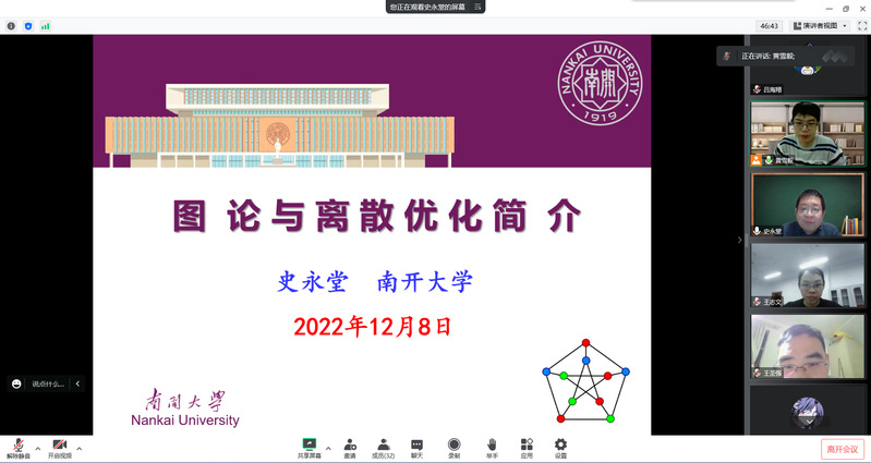 12月8日晚,beat365体育官网举办《图论与组合数学》课程思政专题报告会,南开大学史永堂教授、上海电力大学孙玉芹教授分别作了题为“图论与离散优化简介”和“数学建模培养复杂工程能力—图论案例选讲”的专题报告。报告会由beat365体育官网副院长俞绍文主持,学院部分师生在线参加报告会。